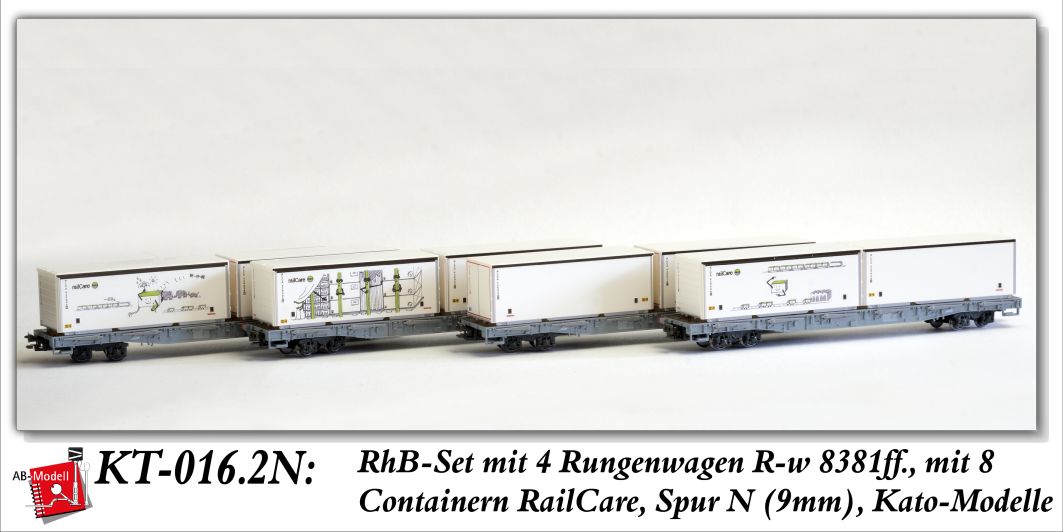RhB-Rungenwagenset mit R-w 8381, 8382, 8383, 8384 mit Drehrungen,Spur N (9mm), beladen mit RailCare-Containern, Hersteller ist die Firma Kato - AUSVERKAUFT | Neuheiteninfo |