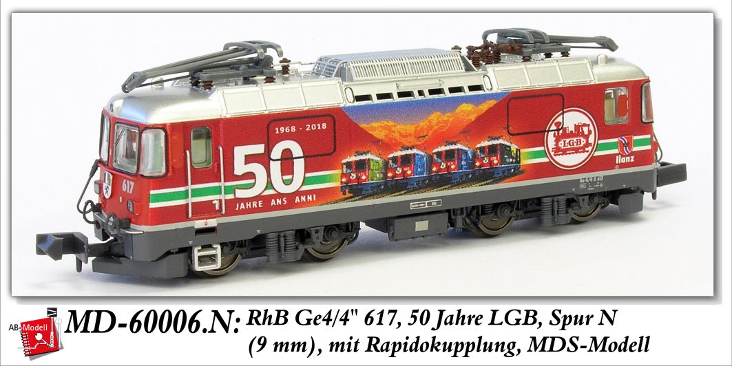 Ge4/4'' 617, RhB-Werbelok "50 Jahre LGB", Spur N, erhältlich in den Ausführungen analog, digital (-D.N) oder digital mit Sound (-S.N). Hersteller MDS. Seit dem 14.12.2024 vertreiben wir dieses Modell nicht mehr. | |||