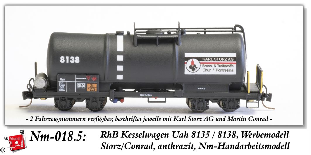 | NEU 2026: RhB - Uah 8135 bzw. 8138, Tankwagen anthrazit, mit Werbetafeln Storz und Conrad | ![]() |